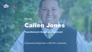 A welcoming graphic featuring Callen Jones, the newest member of the TransNetwork Board. The image shows Callen smiling with the text “Welcome Callen Jones, TransNetwork Board announcement” and “Empowering Tampa Bay’s LGBTQIA+ community” alongside the TransNetwork logo.