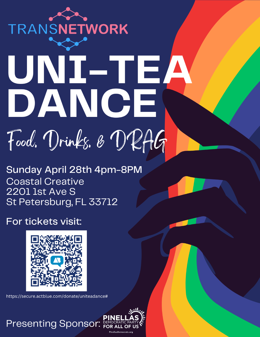 The UNI-TEA Dance will be Sunday, April 28th from 4-8pm at Coastal Creative 2201 1st Ave S, Saint Petersburg, FL 33712. UNI-TEA is open to the public and is an 18+ event. General admission as well as exclusive VIP tickets are available through the ActBlue Portal (https://secure.actblue.com/donate/uniteadance# ). Sponsorship opportunities are still available for businesses, organizations, and dedicated individuals. More on the ActBlue site. There will be entertainment from some of Pinellas County’s top drag performers, a silent auction of art from local makers and artists, 3 bars, well known local food vendors, distinguished members of the community, leaders, politicians, activists, and more, all coming together to celebrate our strength when we are as one.